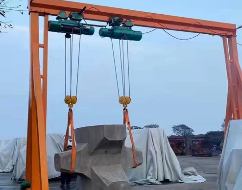 鋼絲繩電動葫蘆安裝在龍門吊上,使用兩條吊裝帶,分別固定在石料兩端,鋼絲繩電動葫蘆鉤掛吊裝帶,緩慢起吊石料。龍門吊萬向輪移動,同時帶動石料移動,輕松完成石料搬運工作。龍門吊移動到指定區域后,鋼絲繩電動葫蘆將石料降落到地面上。石料廠使用龍門吊、鋼絲繩電動葫蘆、吊裝帶等工具,快速完成石料搬運工作,節省人力勞動,提高工作效率。